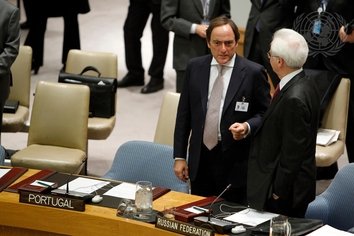 Paulo Portas (left), Minister for Foreign Affairs of Portugal, speaks with Vitaly I. Churkin, Permnanent Representative of the Russian Federation to the UN, before the Security Council’s meeting on Syria.
