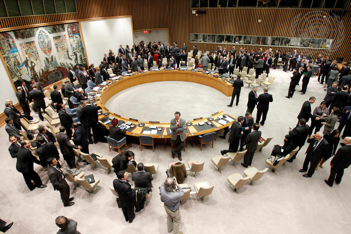 A wide view of the Security Council Chamber as representatives arrive for a meeting on the situation in Syria.