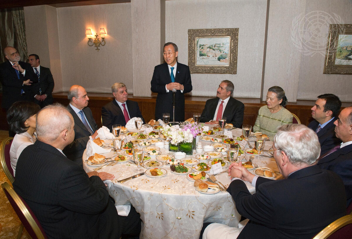 Secretary-General Ban Ki-moon (standing) and his wife, Yoo Soon-taek (third from right), attend a dinner hosted by Jordanian Foreign Minister Nasser Judeh (right of Mr. Ban), in their honour, in Amman, Jordan. Pictured left of Mr. Ban is Jordan’s Awn Khasawneh, Prime Minister and Minister of Defence of Jordan.