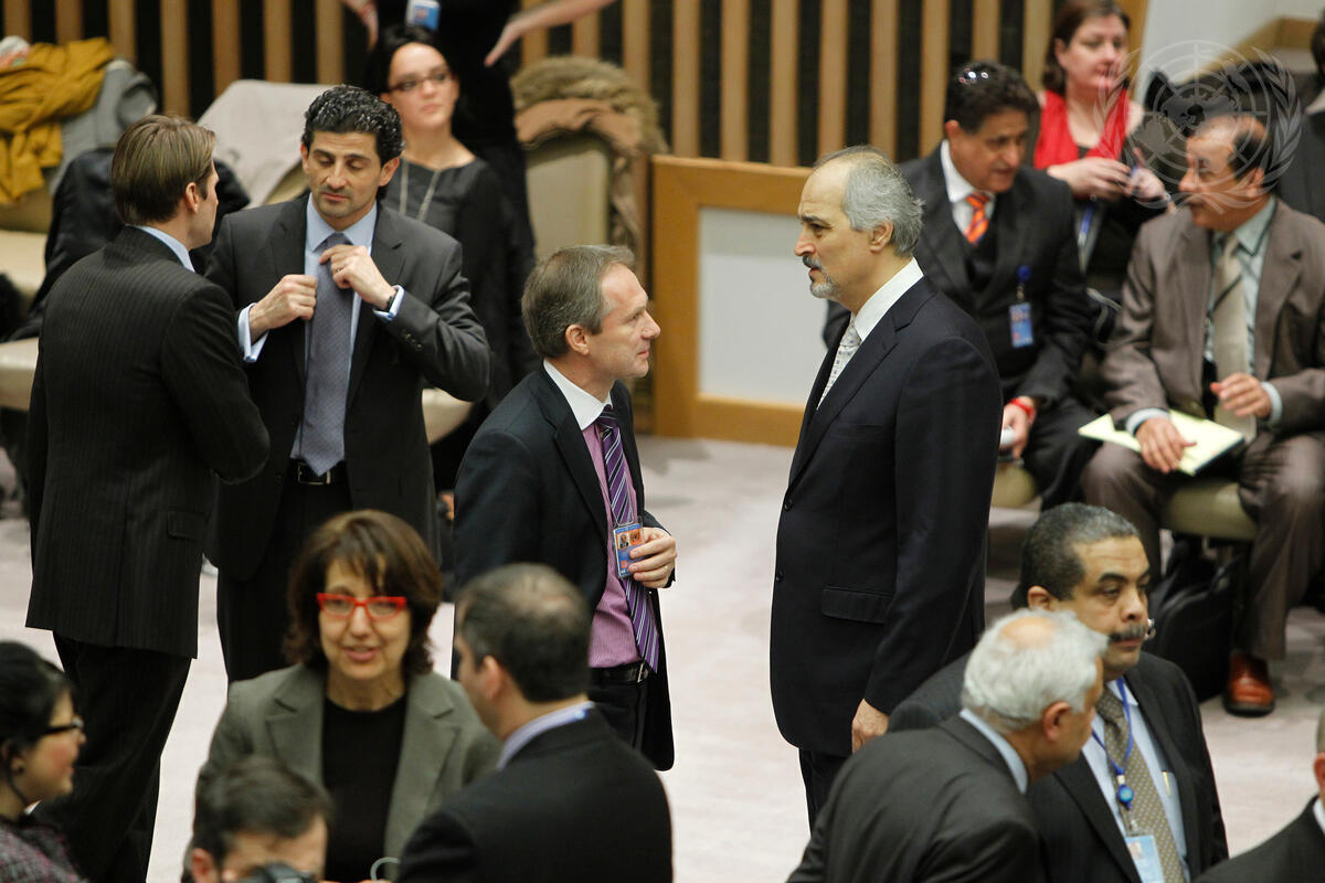 Bashar Ja’afari (centre right), Permanent Representative of Syria to the UN, chats with a colleague inside the Security Council Chamber before the Council’s meeting on his country.