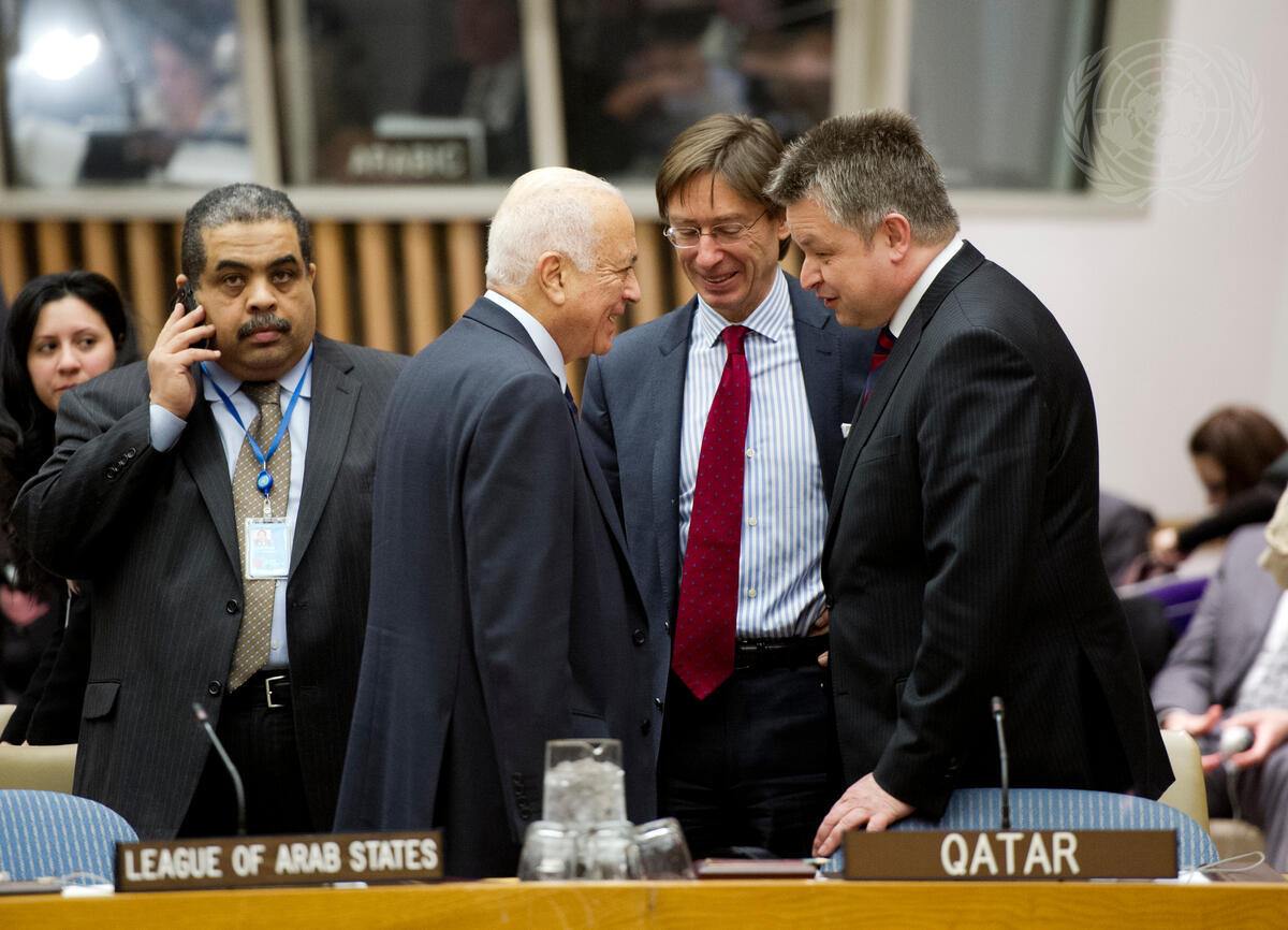 Michael Link (right), Minister of State at the Federal Foreign Office of Germany, and Peter Wittig (second from right), Germany’s Permanent Representative to the UN, speak with Nabil el-Araby, Secretary General of the League of Arab States, before the Security Council’s meeting on the situation in Syria.