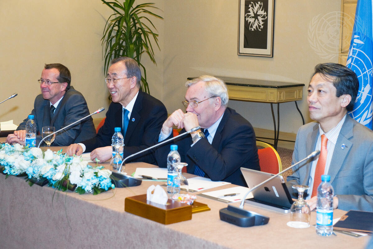 Secretary-General Ban Ki-moon (second from left) meets with the UN Country Team for Iraq (made up of the heads of UN agencies in that country), in Amman, Jordan. He is joined by, from left, Martin Kobler, his Special Representative for Iraq and Head of the UN mission in the country (UNAMI); B. Lynn Pascoe, Under-Secretary-General for Political Affairs; and Kim Won-soo, his Deputy Chef de Cabinet.