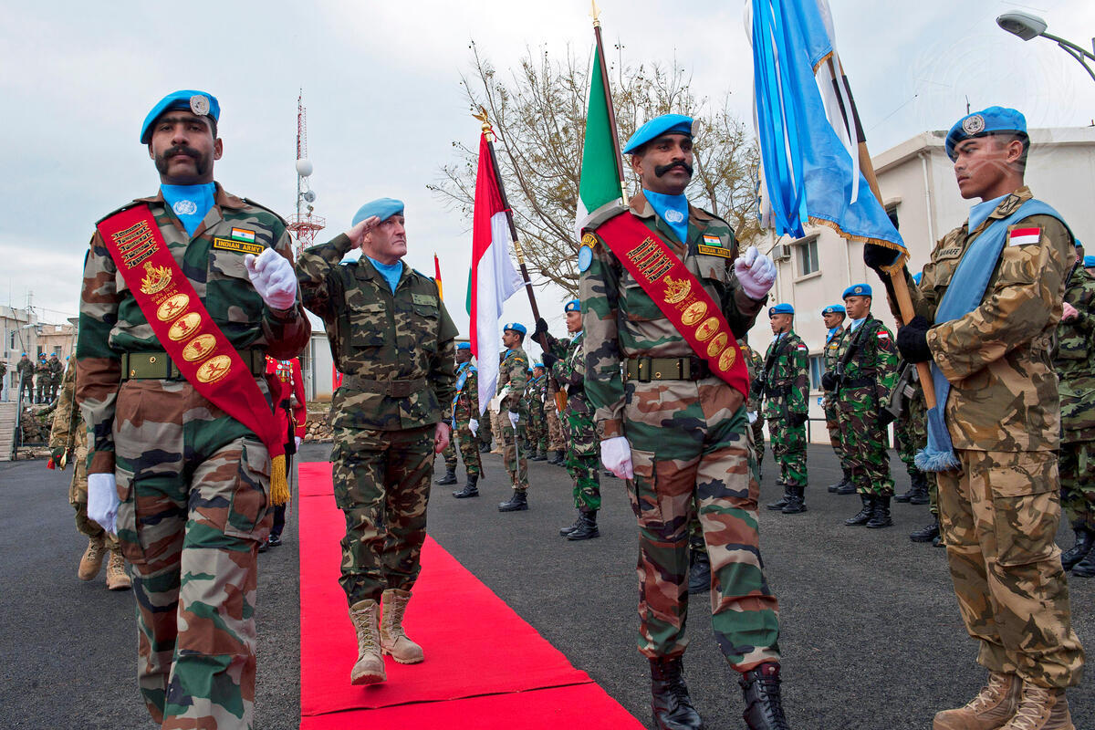 Major-General Alberto Asarta Cuevas (centre), outgoing Force Commander of the UN Interim Force in Lebanon (UNIFIL), reviews UNIFIL’s ceremonial guard before relinquishing command in Naqoura, Lebanon. New Force Commander Major-General Paolo Serra formally takes up his duties today.