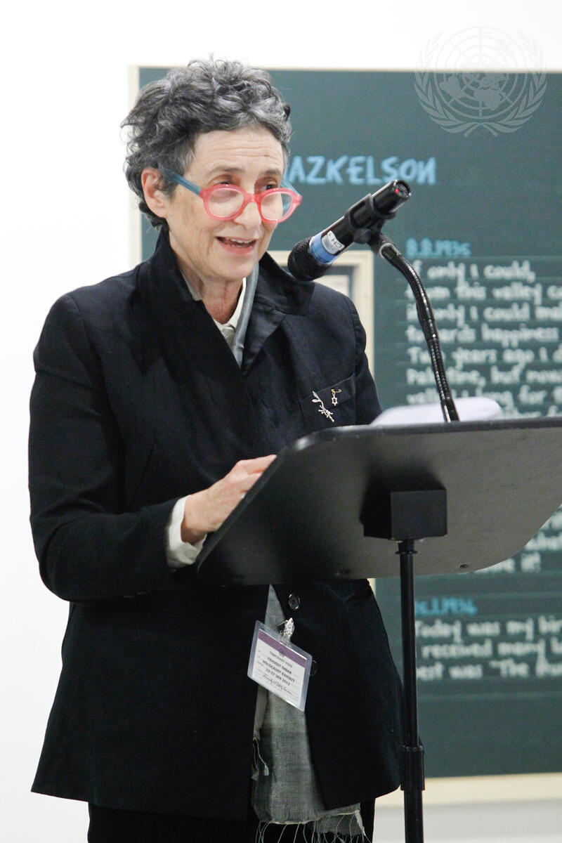 Yehudit Inbar, Director of the Museums Division at Yad Vashem and curator of the exhibit, “Monument of Good Deeds: Dreams and Hopes of Children During the Holocaust”, speaks at the opening of the exhibit at UN Headquarters. “Children During the Holocaust” was presented alongside “The Holocaust - Keeping the Memory Alive”, both organized in conjunction with the annual International Day of Commemoration in Memory of the Victims of the Holocaust (27 January).