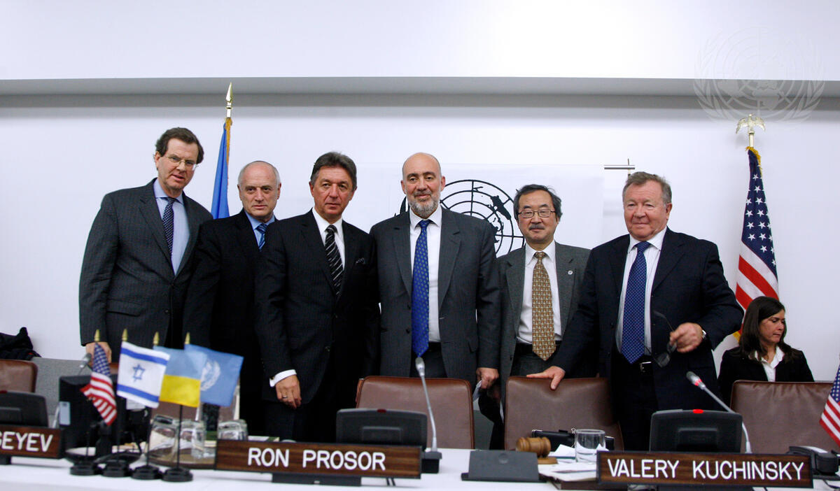 From left: David Harris, President of the American Jewish Committee; Malcolm Hoenlein, Executive Vice Chairman of the Conference of Presidents of Major American Jewish Organizations; Yuriy Sergeyev, Permanent Representative of Ukraine to the UN; Ron Prosor, Permanent Representative of Israel to the UN; Kiyo Akasaka, Under-Secretary-General for Communications and Public Information; and Valeriy Kuchinsky, former Permanent Representative of Ukraine to the UN.