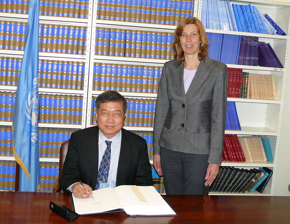 Jakkrit Srivali (seated), Deputy Permanent Representative of Thailand to the UN, signs the Nagoya Protocol on Access to Genetic Resources and the Fair and Equitable Sharing of Benefits Arising From Their Utilization to the Convention on Biological Diversity. Beside Mr. Srivali is Gabriele Goettsche-Wanli, Chief of the Treaty Section in the UN Office of Legal Affairs.