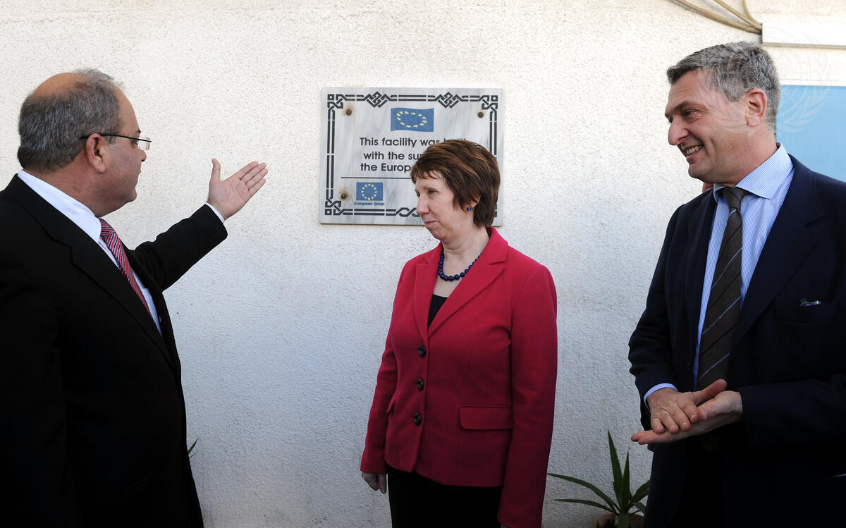 Catherine Ashton (centre), High Representative of the European Union (E.U.) for Foreign Affairs and Security Policy, vitis the Gaza Training College with Filippo Grandi (right), Commissioner-General of the United Nations Relief and Works Agency for Palestine Refugees in the Near East (UNRWA). During her visit in Gaza, Ms. Ashton pledged $50 million in financing toward the UN Relief and Works Agency for Palestine Refugees in the Near East (UNRWA).