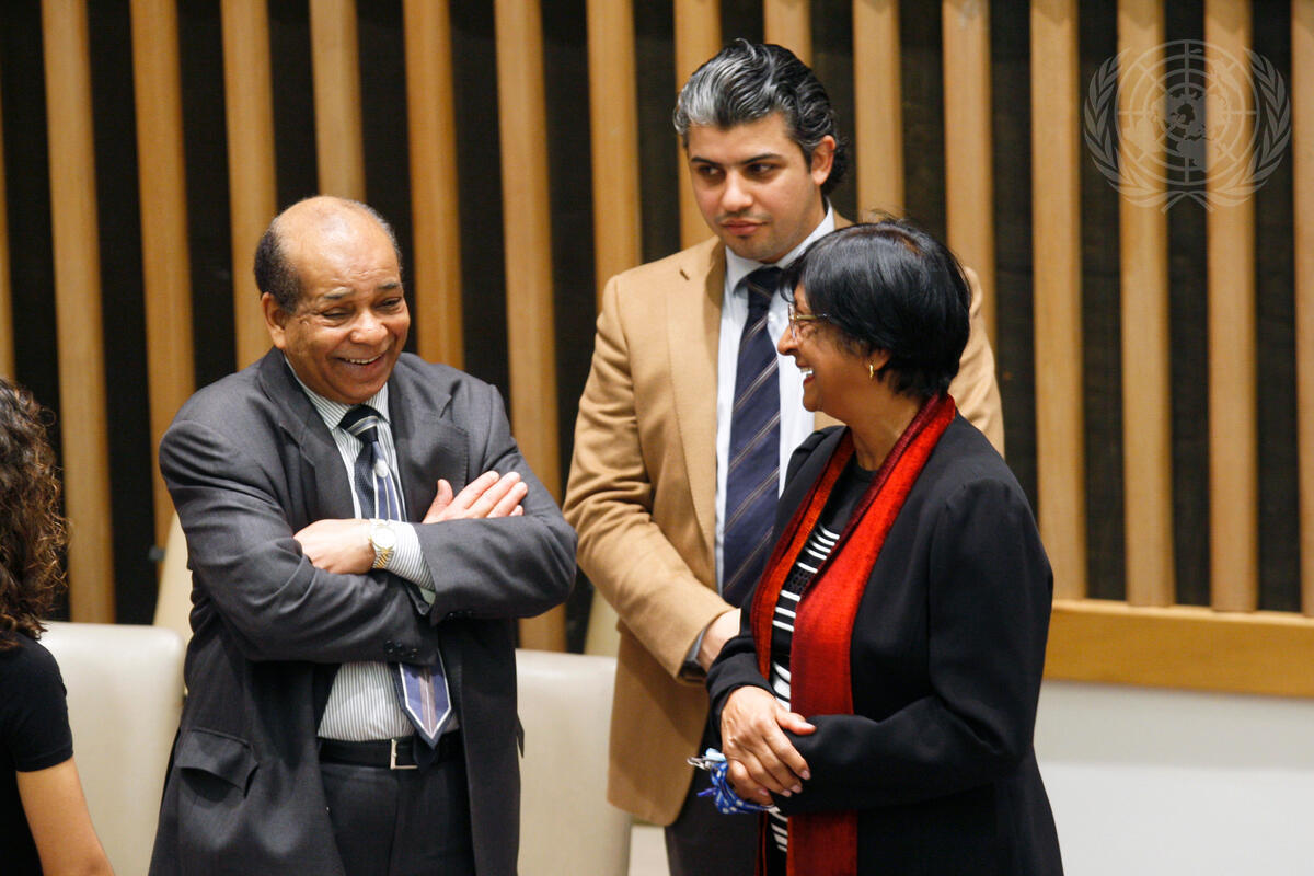 Abdurrahman Mohamed Shalgham (left), Representative of Libya, chats with Navi Pillay (left), UN High Commissioner for Human Rights, before a meeting of the Security Council on the situation in his country.
