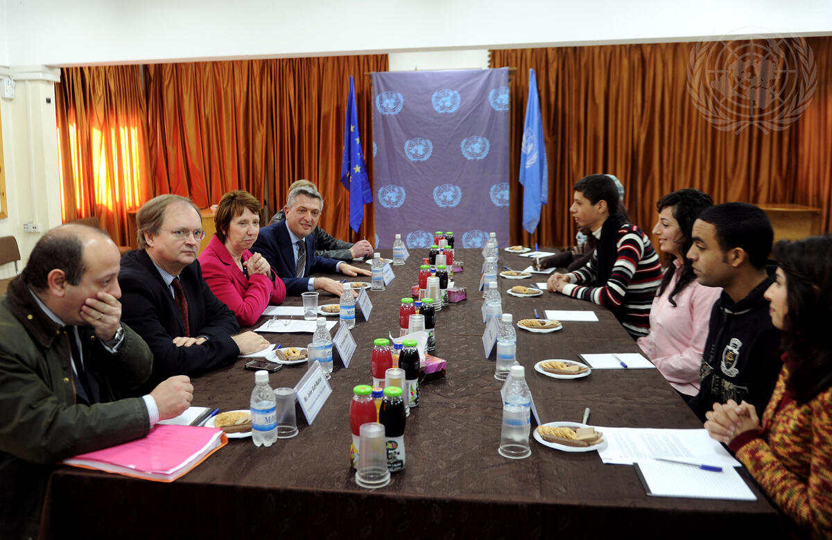 Catherine Ashton (centre left), High Representative of the European Union (E.U.) for Foreign Affairs and Security Policy, vitis with students and staff at the Gaza Training College with Filippo Grandi (to her left), Commissioner-General of the United Nations Relief and Works Agency for Palestine Refugees in the Near East (UNRWA). During her visit in Gaza, Ms. Ashton pledged $50 million in financing toward the UN Relief and Works Agency for Palestine Refugees in the Near East (UNRWA).