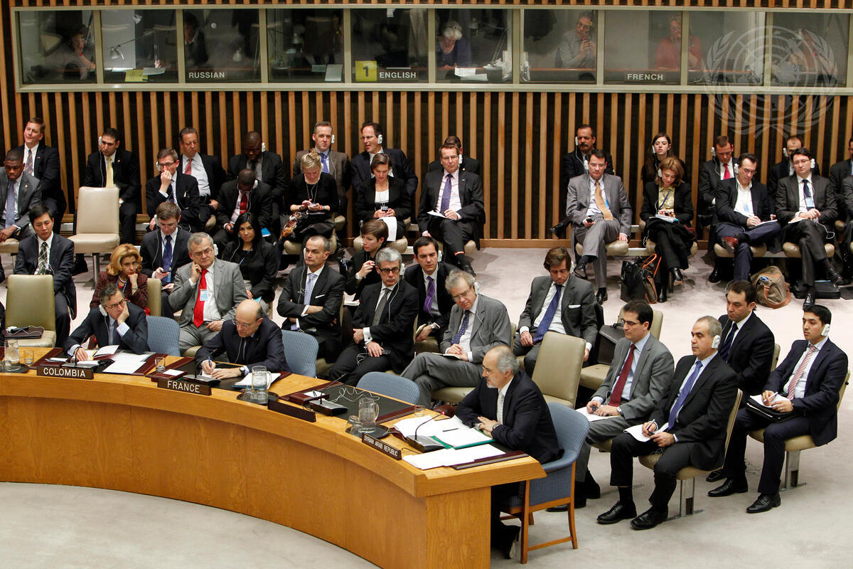 Bashar Ja’afari (right), Permanent Representative of Syria to the UN, speaks at the Security Council meeting on his country. Also pictured on the Council (from left): Néstor Osorio, Permanent Representative of Colombia to the UN, and Alain Juppé, Minister for Foreign Affairs of France.