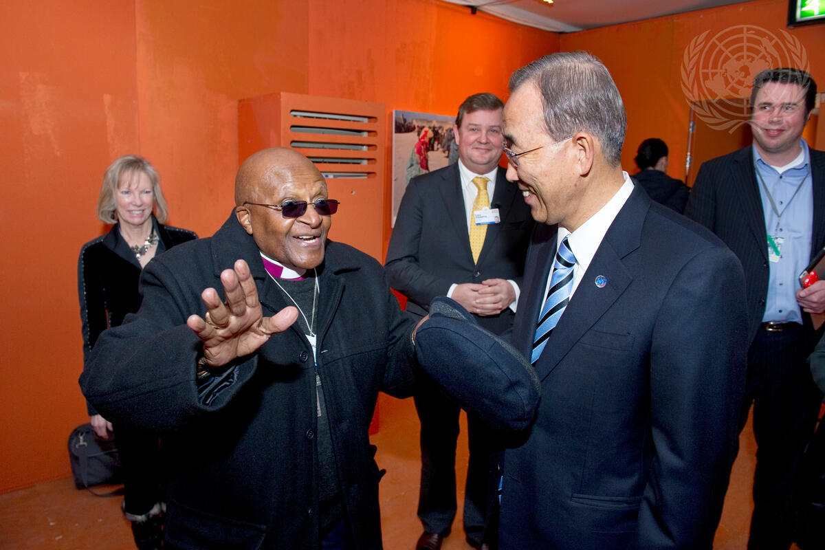Secretary-General Ban Ki-moon (right) meets with Archbishop Desmond Tutu during the World Economic Forum meeting, held in Davos, Switzerland.