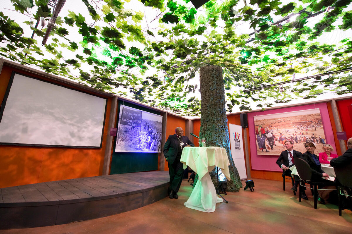 As the World Economic Forum meeting continues in Davos today, Secretary-General Ban Ki-moon and Archbishop Emeritus Desmond Tutu (at podium) hosted a private sector brainstorming luncheon that focuses on creating a better world for women and girls. The event will highlight the Every Woman, Every Child initiative, spearheaded by Secretary-General Ban Ki-moon, to mobilize and intensify global action to improve the health of women and children around the world.