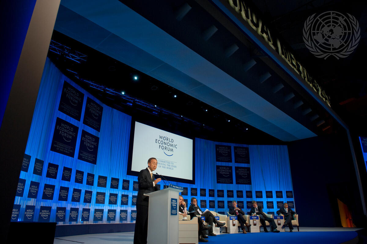 Secretary-General Ban Ki-moon (left, at podium) addresses an interactive session on “Ending Energy Poverty” at the annual meeting of the World Economic Forum in Davos, Switzerland.