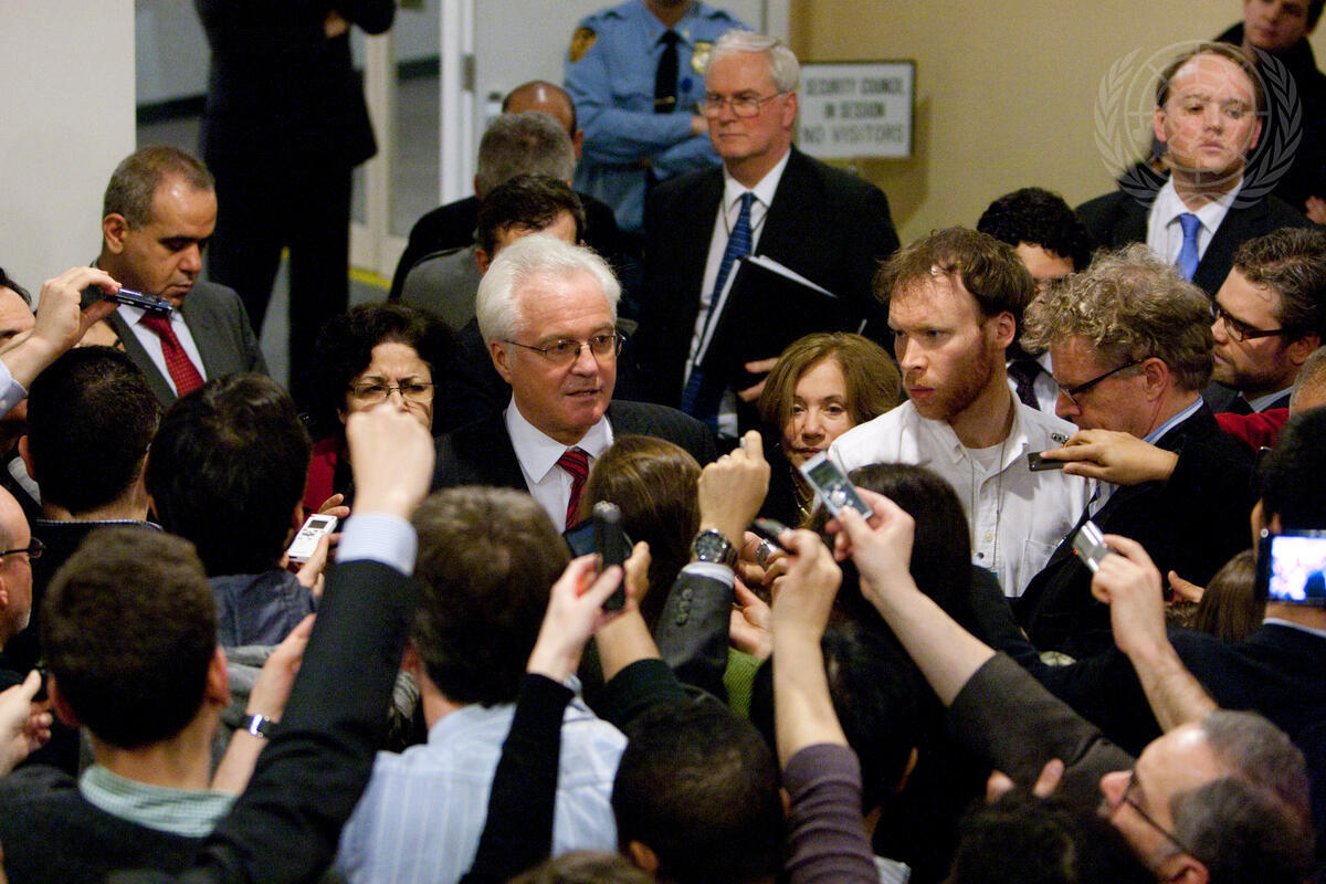 Vitaly I. Churkin (centre), Permanent Representative of Russia to the UN, is approached by a crowd of reporters as he exists the Security Council’s closed-door meeting on Syria. He and other Members of the Council discussed possible draft resolutions addressing the situation in the country.
