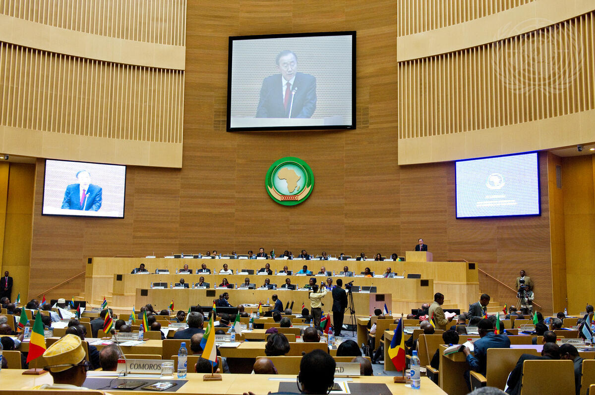 Secretary-General Ban Ki-moon (on screen) speaks at the Opening Ceremony of the 18th Ordinary Session of the Assembly of the African Union in Addis Ababa, Ethiopia.