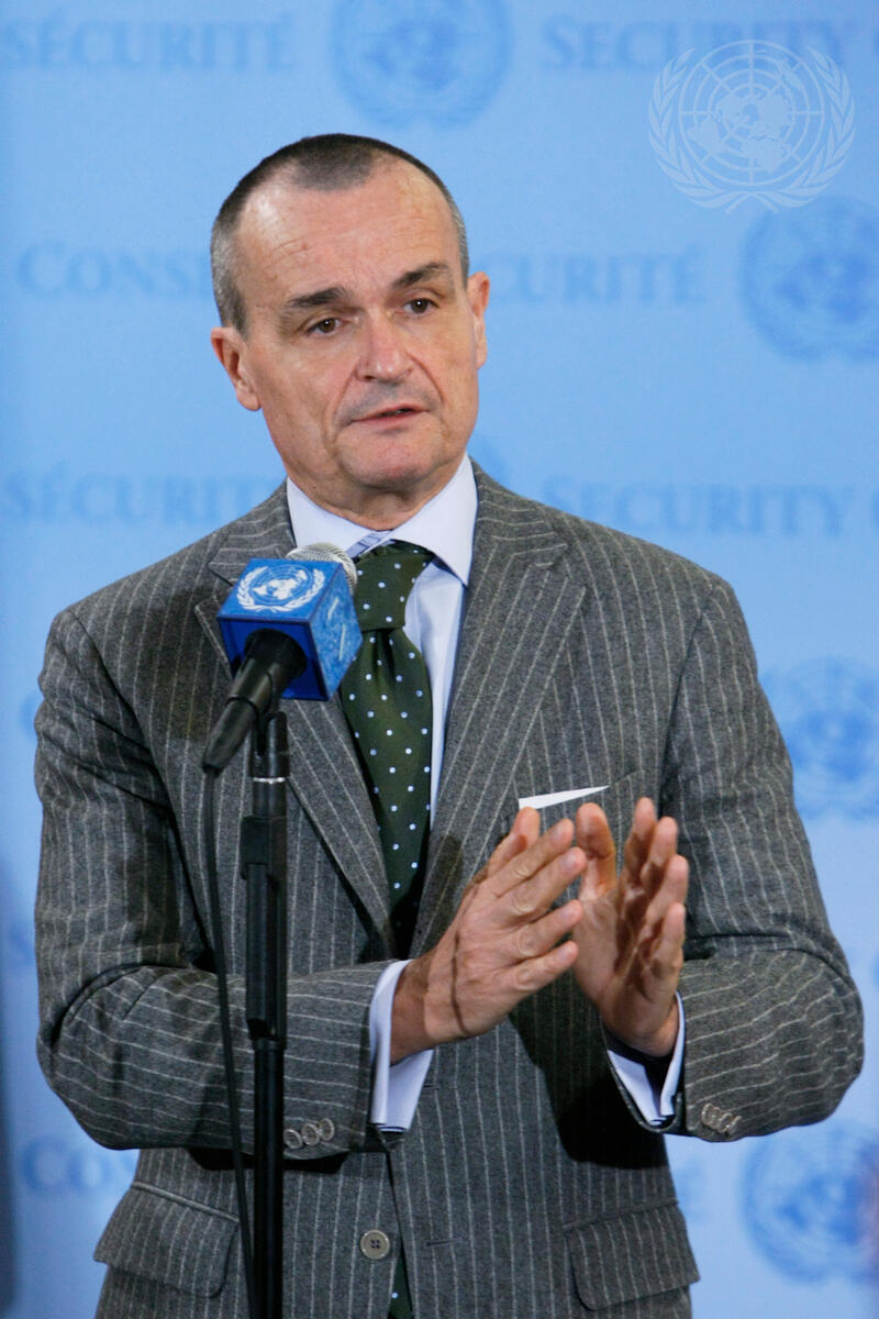 Gérard Araud, Permanent Representative of France to the UN, briefs correspondents following the Security Council’s closed-door meeting on Syria, in which he and other Members of the Council discussed possible draft resolutions addressing the situation in the country.