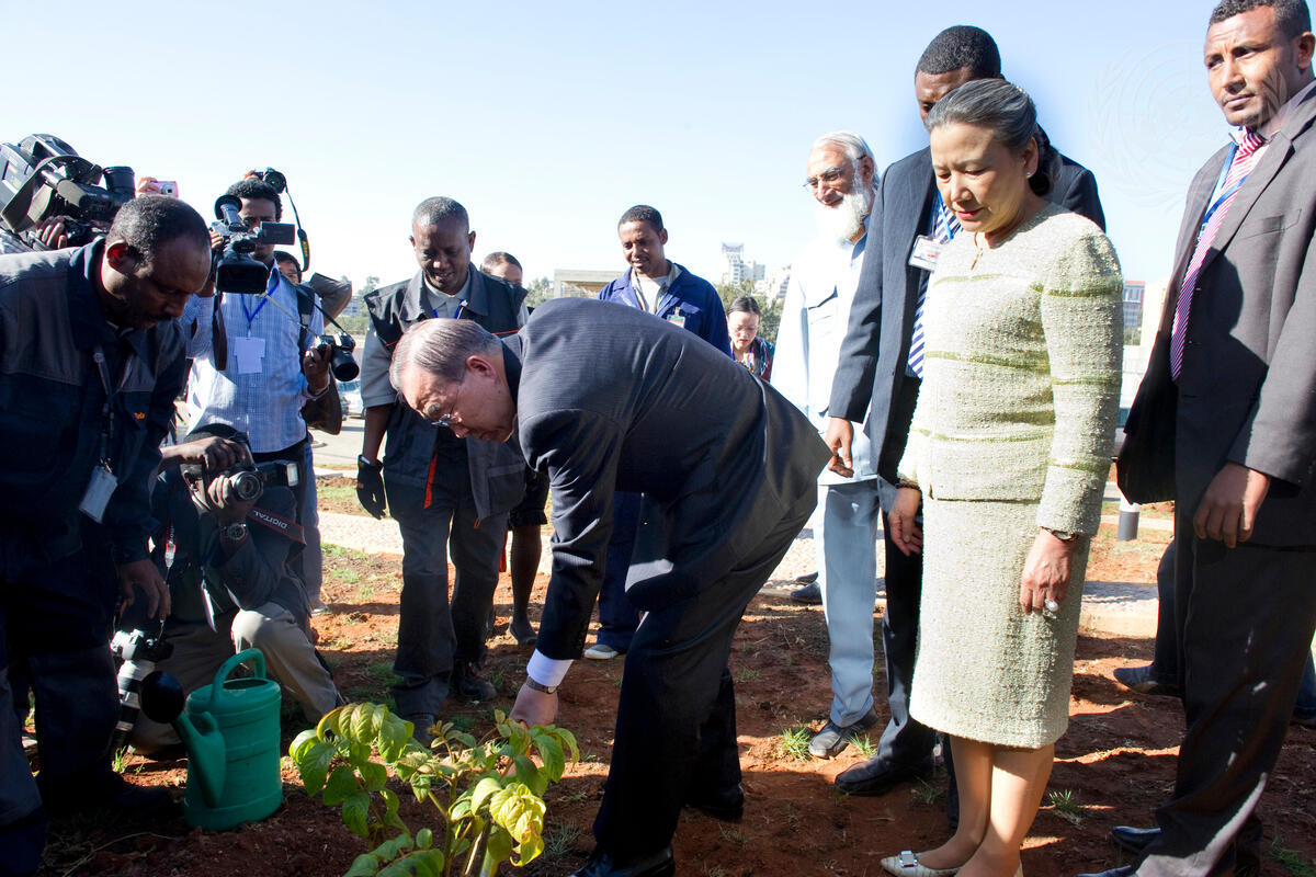 Secretary-General Ban Ki-moon (centre) and his wife, Yoo Soon-taek (second from right), plant a tree outside the offices of the African Union Commission in Addis Ababa, Ethiopia, in memory of Kenyan Nobel-winning environmental activist, Wangari Maathai, who passed away in September 2011.