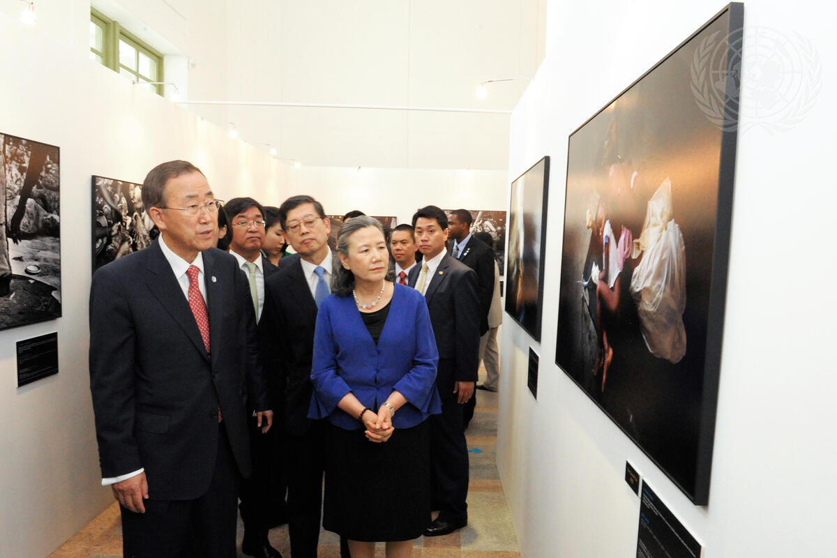 Secretary-General Ban Ki-moon (left) and his wife, Yoo Soon-taek (front, right), see winning images from the Yonhap International Press Photo Awards, whose theme was the the Millennium Development Goals (MDGs), in Seoul, Republic of Korea.