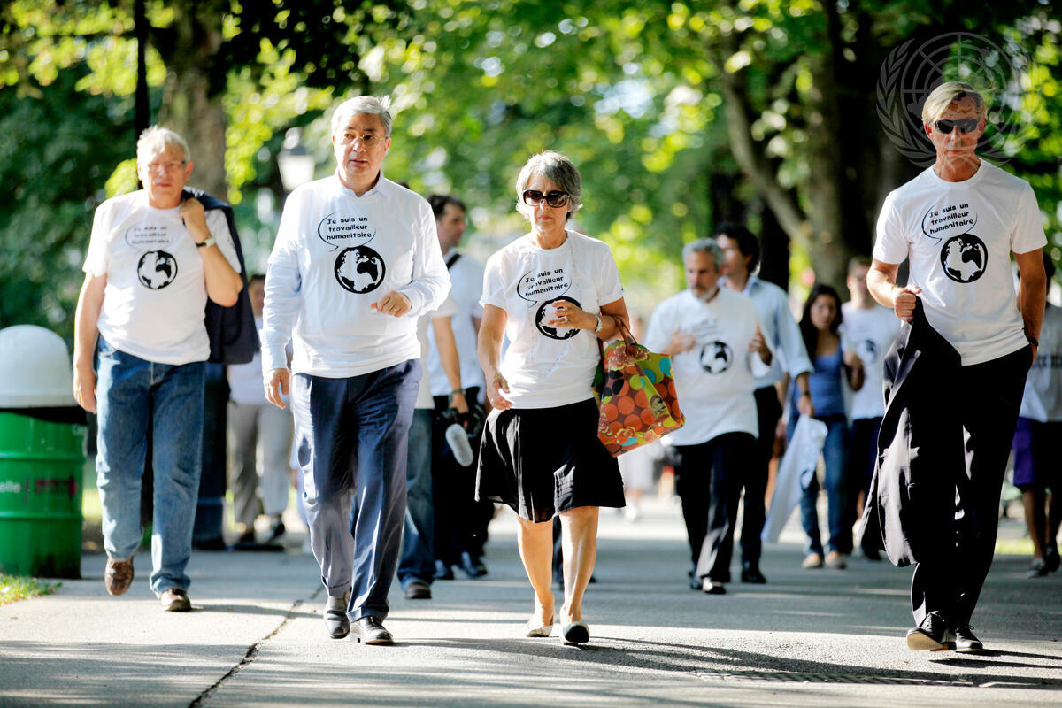 Kassym-Jomart Tokayev (second from left), Director-General of the United Nations Office at Geneva (UNOG), and Annie Vieira de Mello (right of Mr. Tokayev), Vice Chairwoman of the Sergio Vieira de Mello Foundation, take part in World Humanitarian Day activities, walking from the Plaine de Plainpalais to the Parc des Bastions in Geneva, Switzerland.