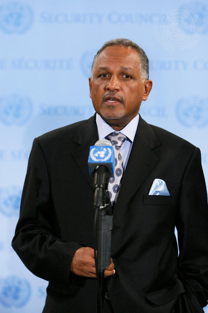 Daffa-Alla Elhag Ali Osman, Permanent Representative of the Republic of the Sudan to the United Nations, briefs correspondents following Security Council consultations regarding his country, Libya, and other matters.