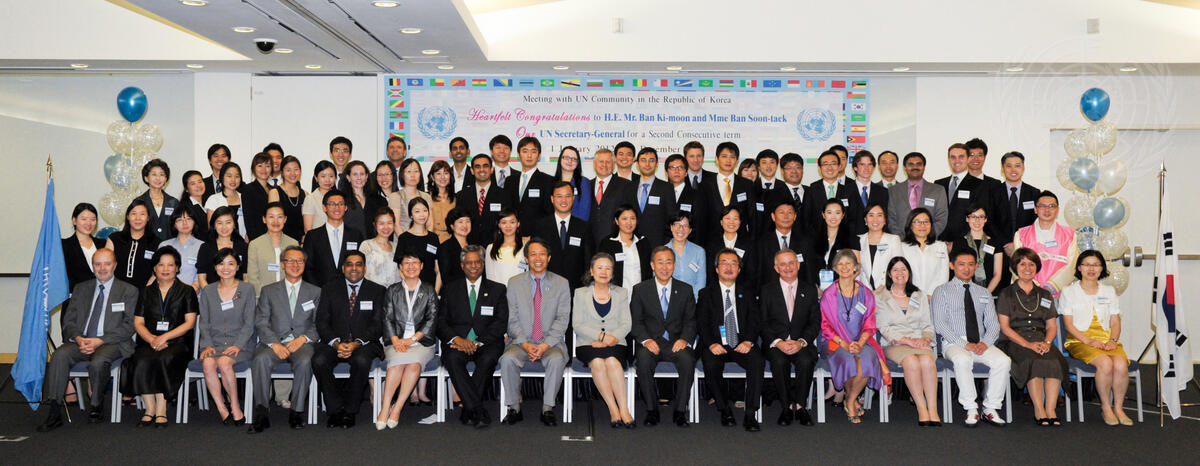 Secretary-General Ban Ki-moon (front, eighth from right) poses for a group photo with UN staff members based in the Republic of Korea, in the city of Incheon. With Mr. Ban are his wife, Yoo Soon-taek (left of Mr. Ban); Kim Won-soo (eighth from left), his Deputy Chef de Cabinet; and Kiyotaka Akasaka (right of Mr. Ban), Under-Secretary-General for Communications and Public Information.