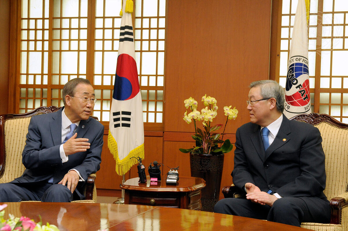 Secretary-General Ban Ki-moon (left) meets with Kim Sung-hwan, Minister for Foreign Affairs and Trade of the Republic of Korea, in Seoul.