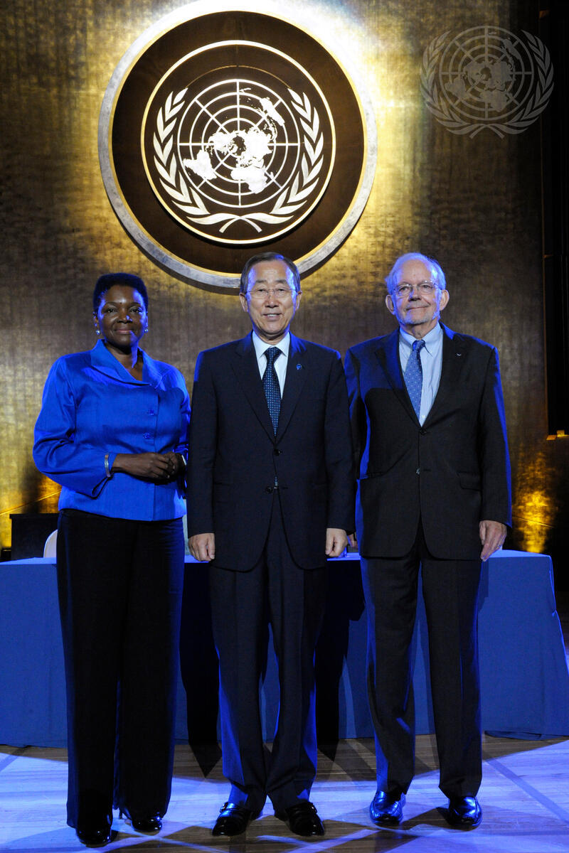 Secretary-General Ban Ki-moon (centre); Valerie Amos (left), Under-Secretary-General for Humanitarian Affairs; and Anthony Lake, Executive Director of the UN Children’s Fund (UNICEF); lead a ceremony commemorating the third annual World Humanitarian Day.
