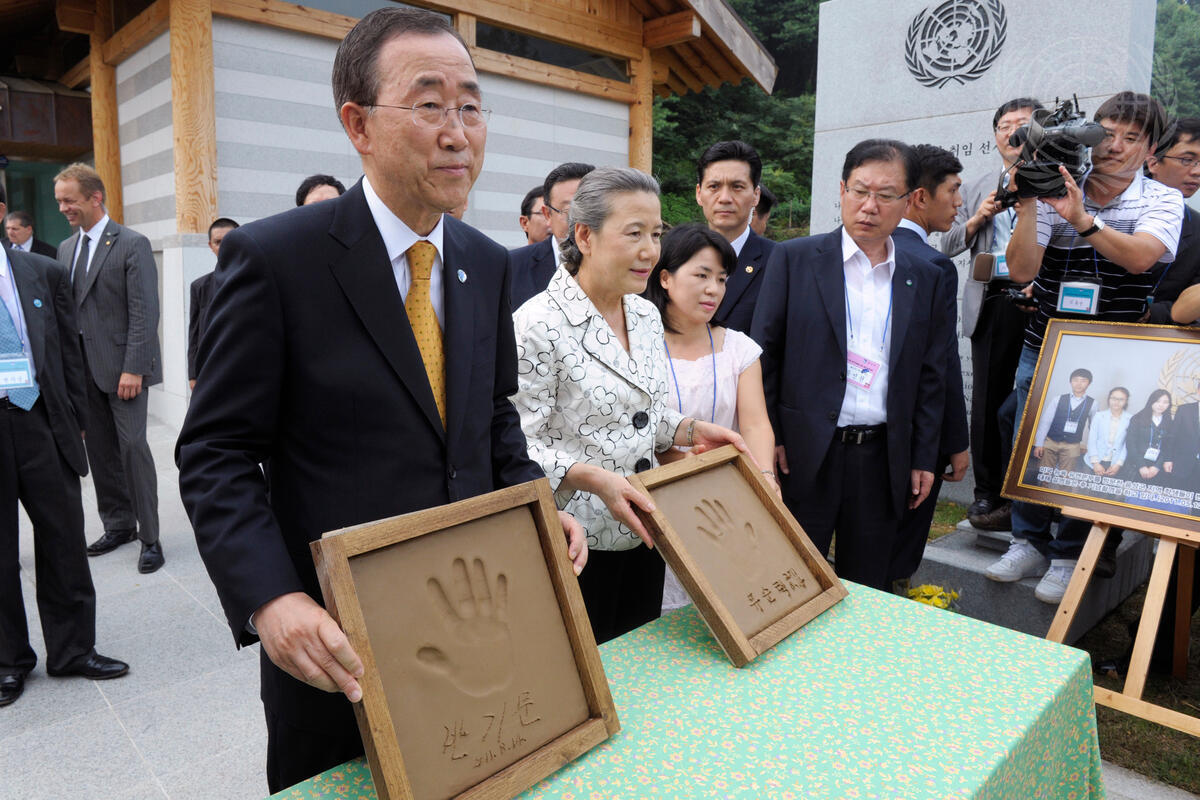 Secretary-General Ban Ki-moon (left) and his wife, Yoo Soon-taek, make handprints for the Ban Ki-moon Memorial Hall, in Mr. Ban's hometown of Eumseong, in North Chungcheong Province, Republic of Korea.