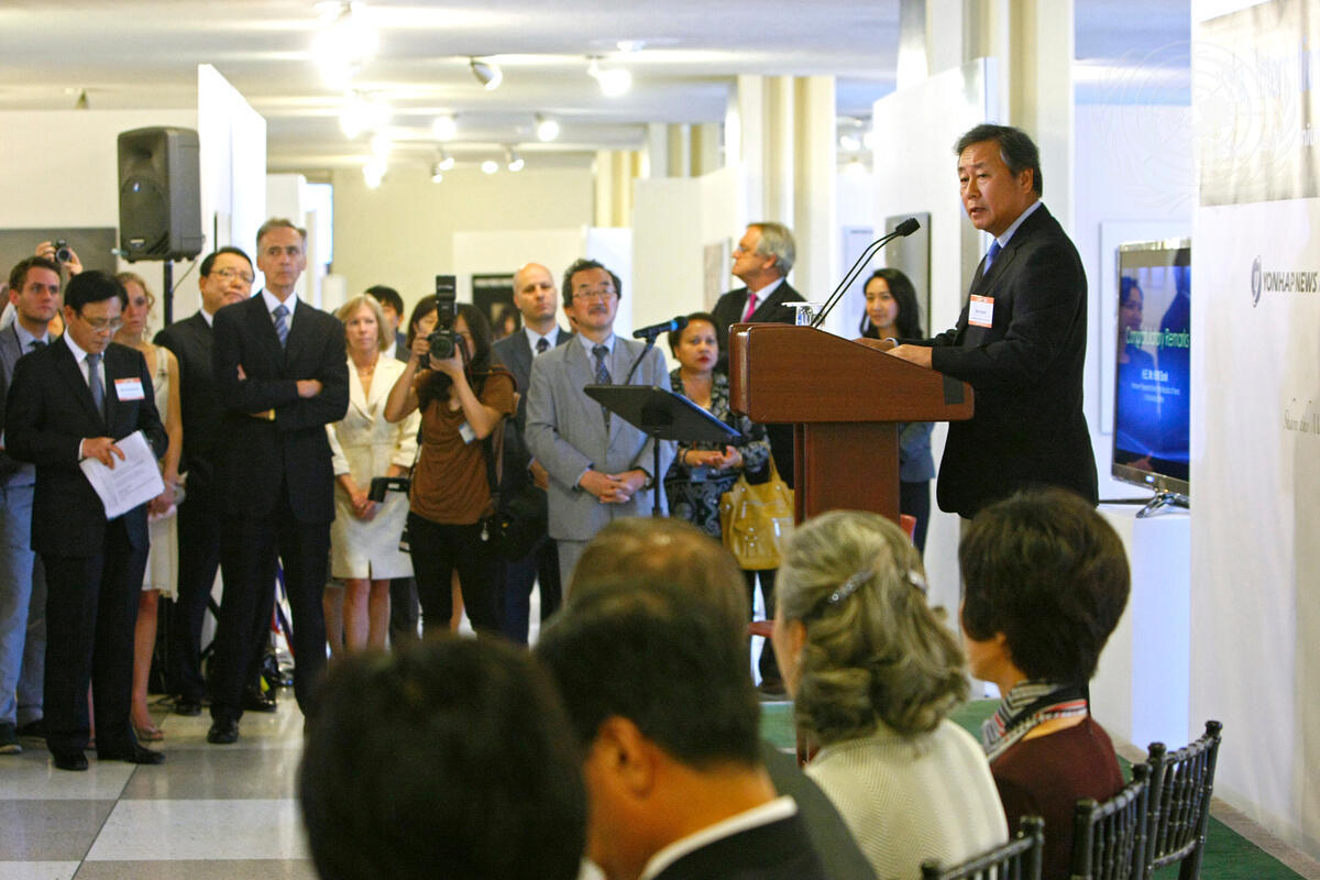 Kim Sook (at podium), Permanent Representative of the Republic of Korea to the UN, speaks at the Yonhap International Press Photo Awards and exhibit opening on the Millennium Development Goals (MDGs), at UN Headquarters.