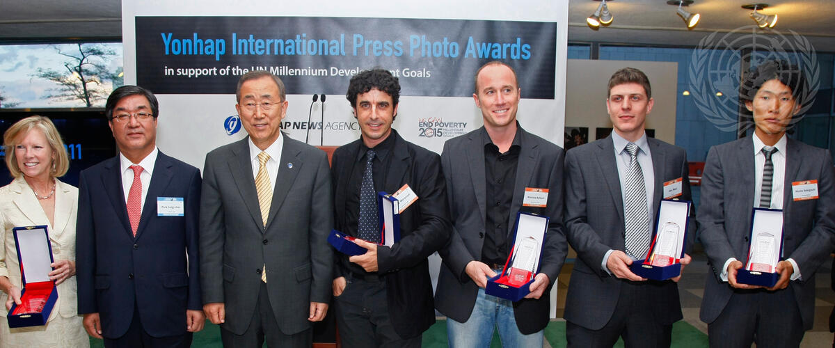 Secretary-General Ban Ki-moon (third from left) poses for a group photo with the Grand Prize winner of the Yonhap International Press Photo Awards on the Millennnium Development Goals (MDGs), Emilio Morennati (right of Mr. Ban), and Gold Prize winners Nicolas Asfouri (third from right); Alex Masi (second from right); and Hiroto Sekiguchi (right). Also pictured are Park Jung-chan (left of Mr. Ban), President and Chief Executive Officer of Yonhap News Agency, and Kathy Calvin, President of the UN Foundation, accepting the Yonhap Media Group Prize on behalf of the Foundation.