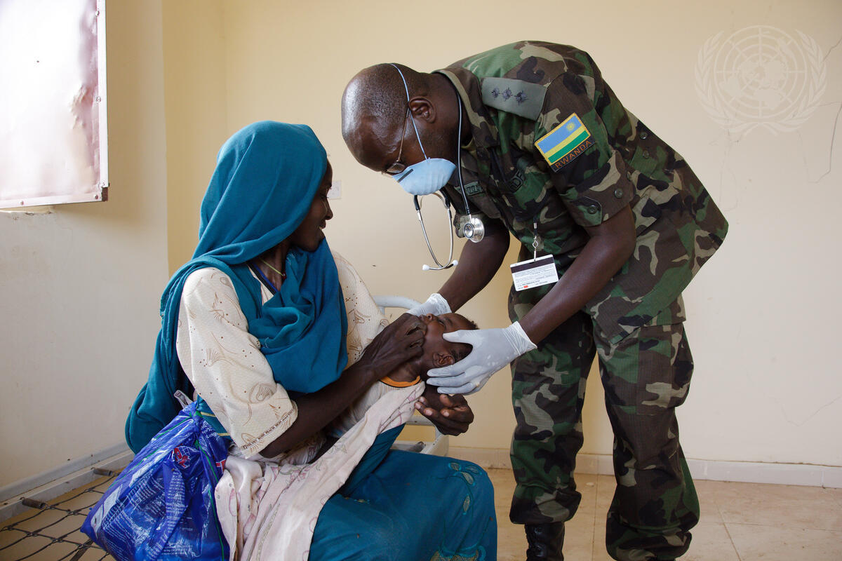 A Rwandan doctor with the African Union-United Nations Hybrid Operation in Darfur (UNAMID) checks a young Darfuri during one of the free medical consultations provided by UNAMID to the population of Shangil Tobaya, in North Darfur, Sudan.