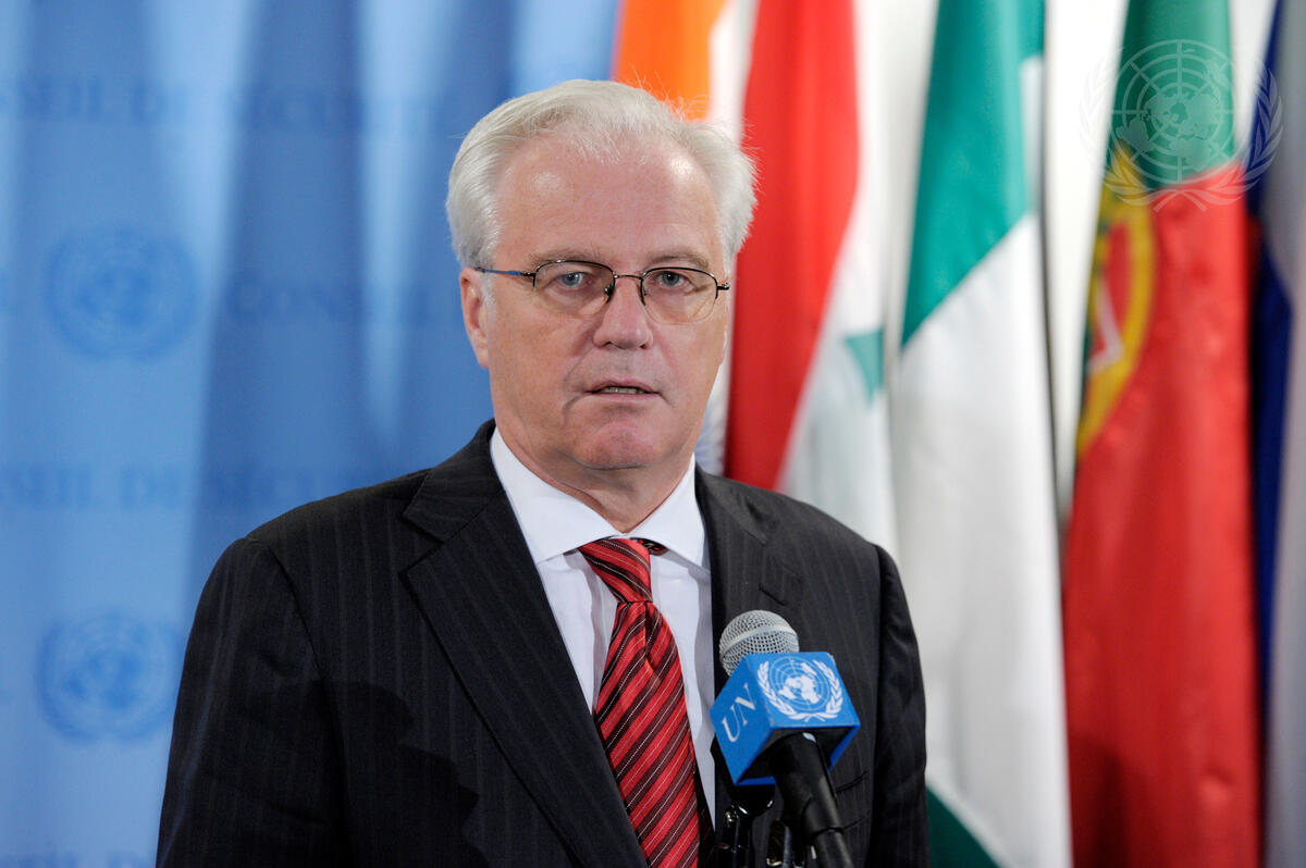 Vitaly Churkin, Permanent Representative of the Russian Federation to the United Nations, briefs correspondents following the Security Council consultations on the situation in the Middle East.