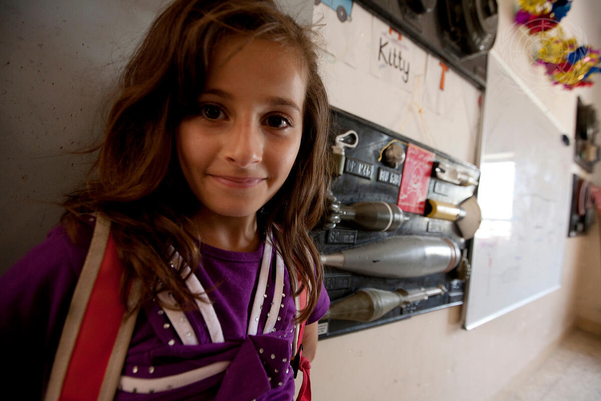 At Ashawa Primary School, a girl stands next to mine awareness materials used in the Mine Risk Education programme, funded by UNICEF and implemented by the General Directorate of Mine Action and the Iraqi Kurdistan Mine Action Agency.