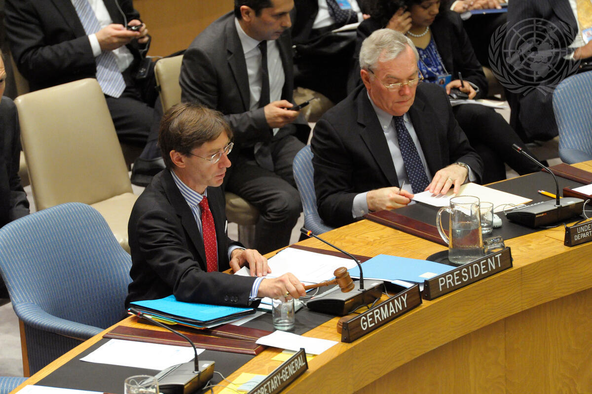 Peter Wittig, President of the Security Council for July 2011 and Permanent Representative of Germany to the United Nations, opens the Security Council meeting to discuss the situation concerning Libya. B. Lynn Pascoe, Under-Secretary-General for Political Affairs, is on the right.