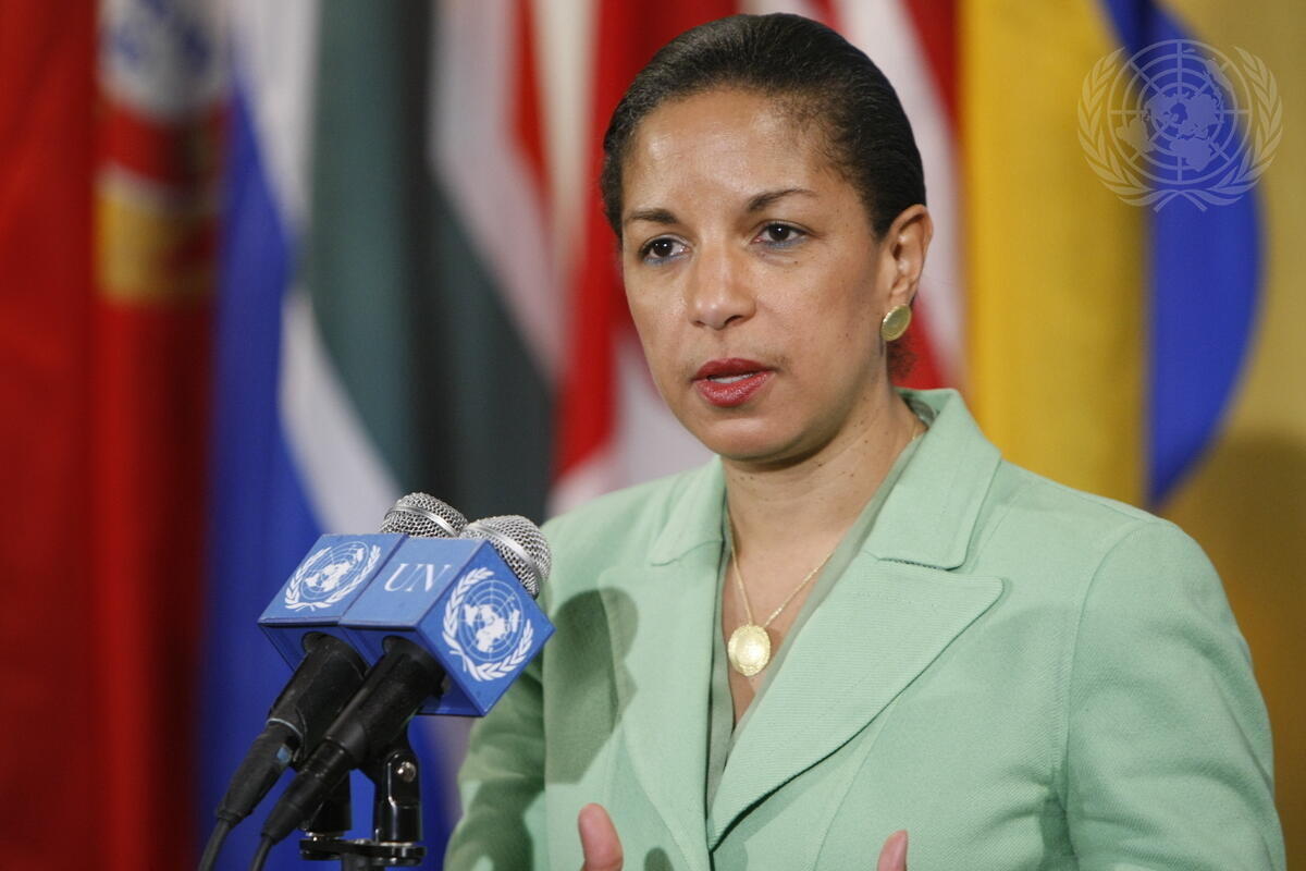 Susan E. Rice, Permanent Representative of the United States of America to the UN, briefs reporters following the Security Council’s adoption of a resolution authorizing the use of military force—including a no-fly zone—in Libya, where civilians continue to come under attack from government forces led by Col. Muammar Al-Qadhafi. Adopted with 10 votes in favour (including the U.S.) and 5 abstentions, the resolution also calls for an immediate ceasefire, widens the assets freeze against senior Libyan officials, and establishes a panel of experts to monitor the implementation of all sanctions against the country.