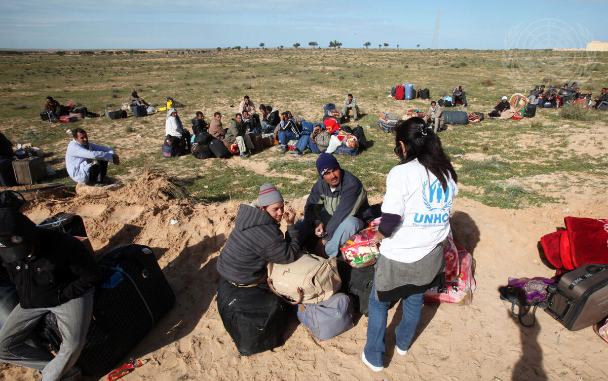 An officer from the UN High Commission for Refugees (UNHCR) speaks with refugees in Ras Djir, Tunisia, among the hundreds fleeing violence across the border in Libya. Crisis erupted in Libya over one week ago when government forces began launching deadly attacks on masses of civilian protesters.