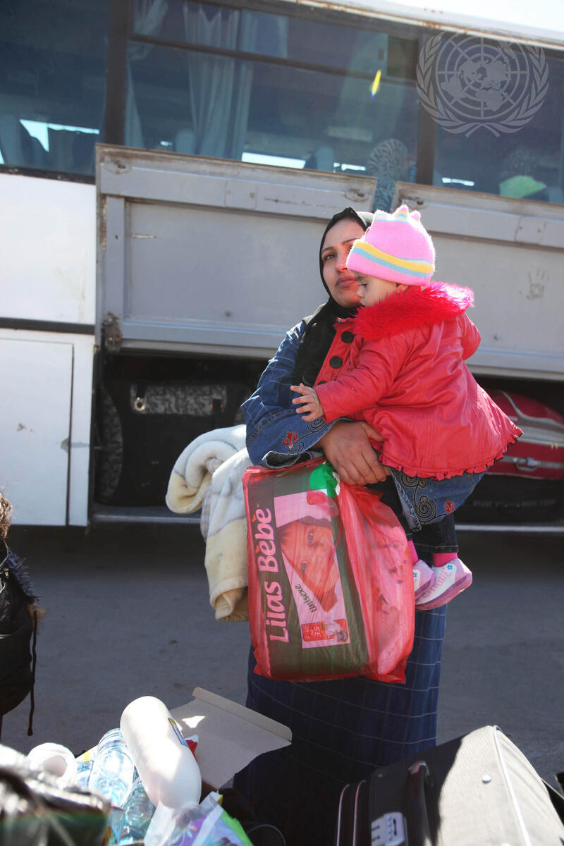 A woman and her child are among the hundreds of refugees fleeing violence in Libya and crossing the border into Ras Djir, Tunisia. Crisis erupted in Libya over one week ago when government forces began launching deadly attacks on masses of civilian protesters.