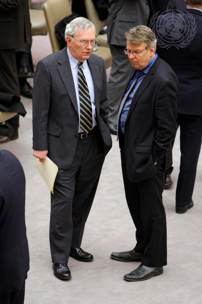 B. Lynn Pascoe (left), Under-Secretary-General for Political Affairs, converses with Morten Wetland, Permanent Representative of Norway to the UN, before a meeting of the Security Council on the situation in Libya. At the meeting Secretary-General Ban Ki-moon briefed on the latest developments there, telling the Council that a week after it had authorized “all necessary measures” to protect Libyan civilians from Colonel Muammar Al-Qadhafi’s forces, speedy and decisive action by the world community remained crucial amid serious concerns of human rights abuses.