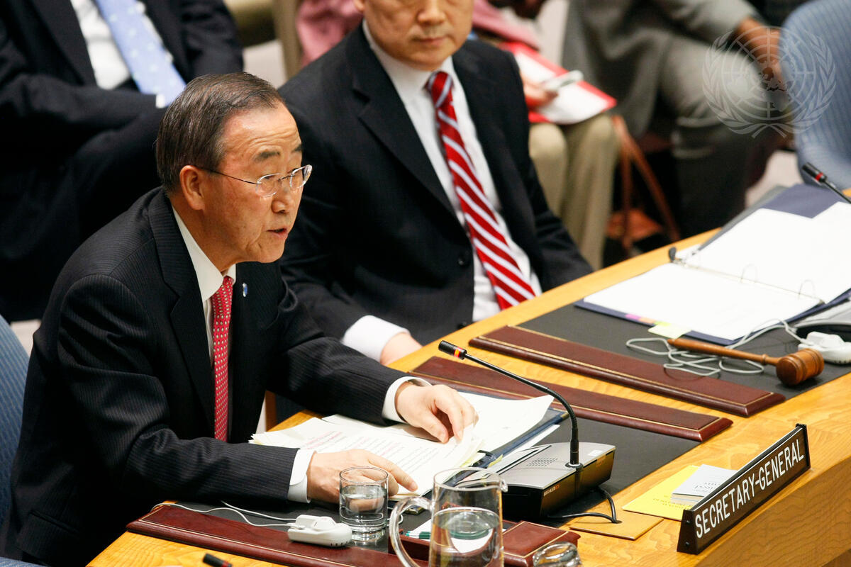 Secretary-General Ban Ki-moon briefs the Security Council on the situation in Libya. He told the Council that a week after the Security Council authorized “all necessary measures” to protect civilians in Libya from Colonel Muammar Al-Qadhafi’s forces, speedy and decisive action by the world community remains crucial amid serious concerns of human rights abuses.