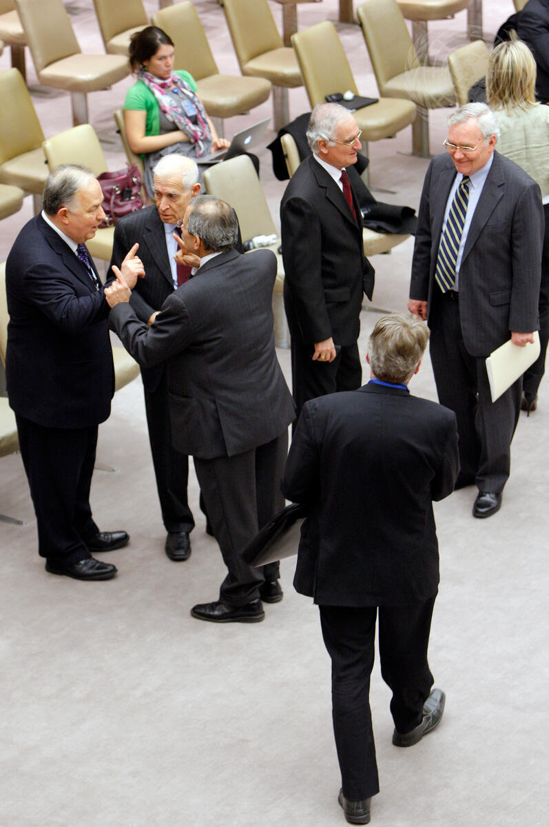 A view inside the Security Council chamber as delegates, including Ertugrul Apakan (left), Permanent Representative of Turkey to the UN; Yahya Mahmassani (second from left), Permanent Observer of the League of Arab States to the UN; and Nawaf Salam (third from left), Permanent Observer of Lebanon to the UN; converse informally before the Council’s meeting on the situation in Libya. Secretary-General Ban Ki-moon briefed on developments there, one week after the Council authorized “all necessary measures” to protect Libyan civilians from Colonel Muammar Al-Qadhafi’s forces.