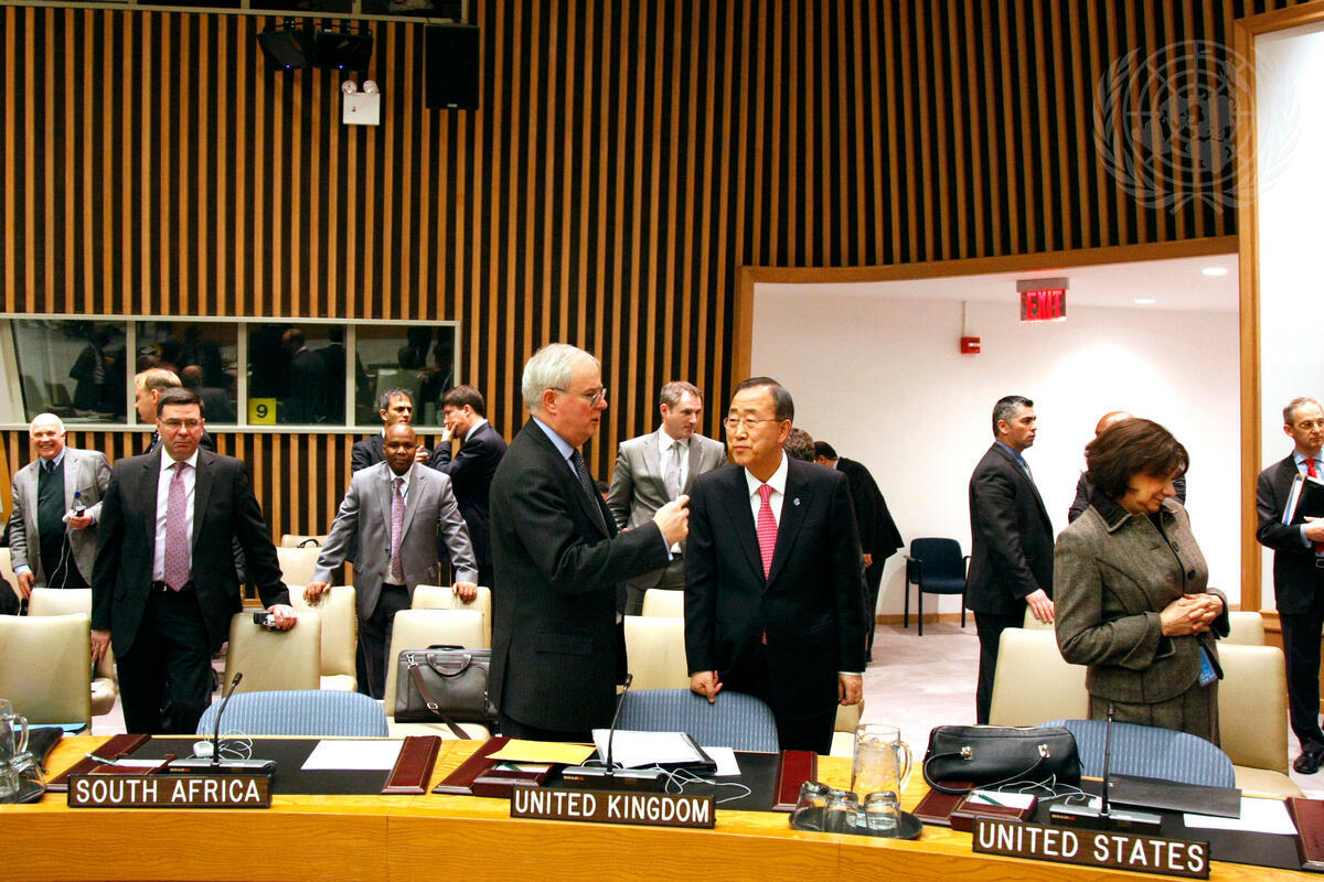 Secretary-General Ban Ki-moon (centre right) converses with Mark Lyall Grant, Permanent Representative of the United Kingdom to the UN, before his briefing to the Security Council on the situation in Libya.