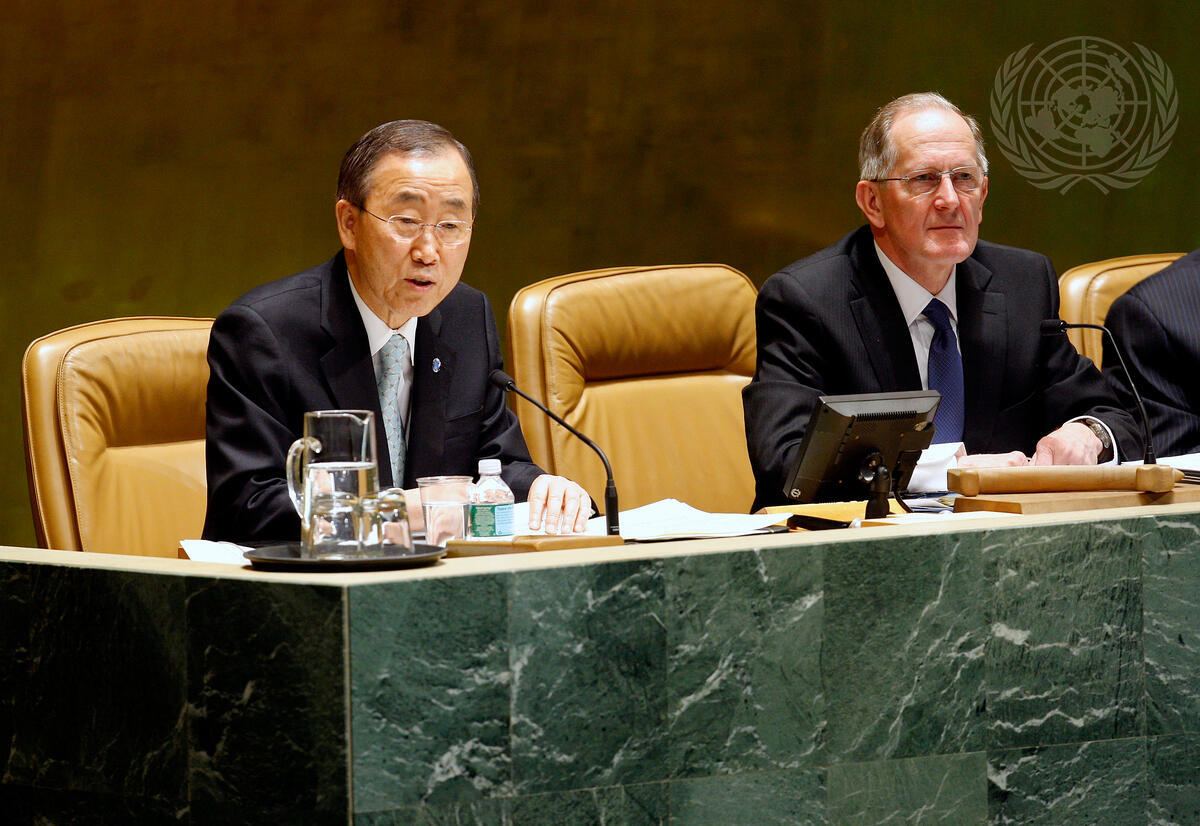 Secretary-General Ban Ki-moon (left) introduces Giorgio Napolitano, President of Italy, at a meeting of the General Assembly. In his address to the Assembly Mr. Napolitano discussed the crisis in Libya, Italy’s Mediterranean neighbour, and underlined European Union support for political, social and economic renewal in the region. Pictured beside Mr. Ban is Joseph Deiss, President of the sixty-fifth session of the General Assembly.