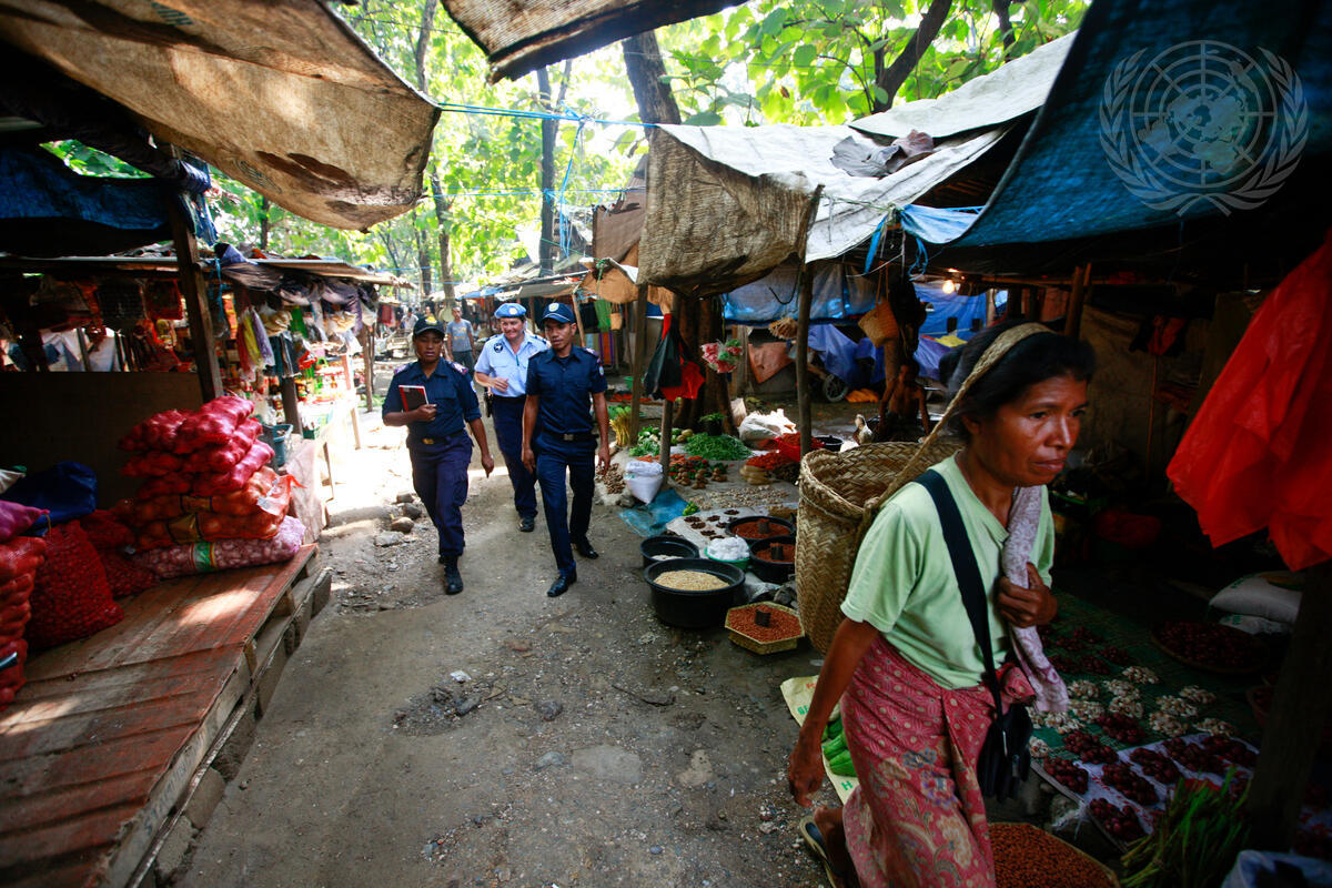 UN Police officers and officers from the Polícia Nacional de Timor-Leste (PNTL) patrol Lahane Market in Dili, Timor-Leste.