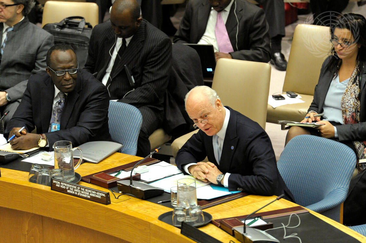 Staffan de Mistura (right), Special Representative of the Secretary-General for Afghanistan and Head of the United Nations Assistance Mission in Afghanistan (UNAMA), briefs the Council on the situation in that country, presenting the Secretary-General’s latest report, “The situation in Afghanistan and its implications for international peace and security”.