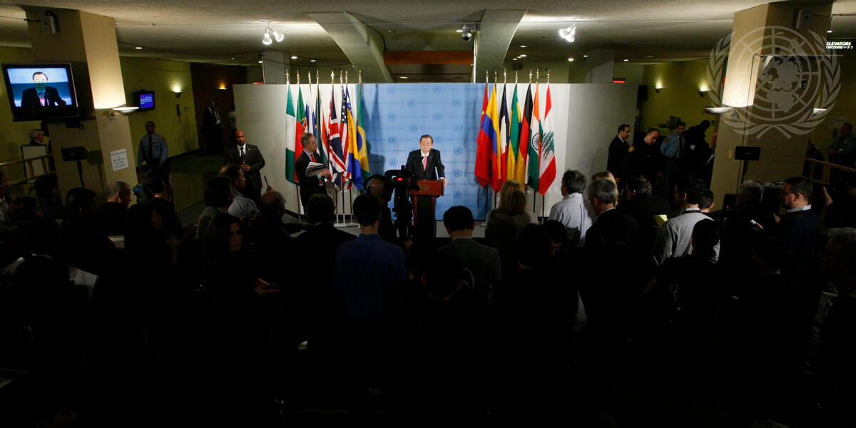 Secretary-General Ban Ki-moon (at podium) briefs correspondents on the situation in Libya and on his recent trips to Egypt and Tunisia, where democratic transitions are underway after spates of anti-government protests. On Libya Mr. Ban voiced concerns over continued human rights abuses, one week after the Security Council authorized “all necessary measures” to protect Libyan civilians from Colonel Muammar Al-Qadhafi’s forces.
