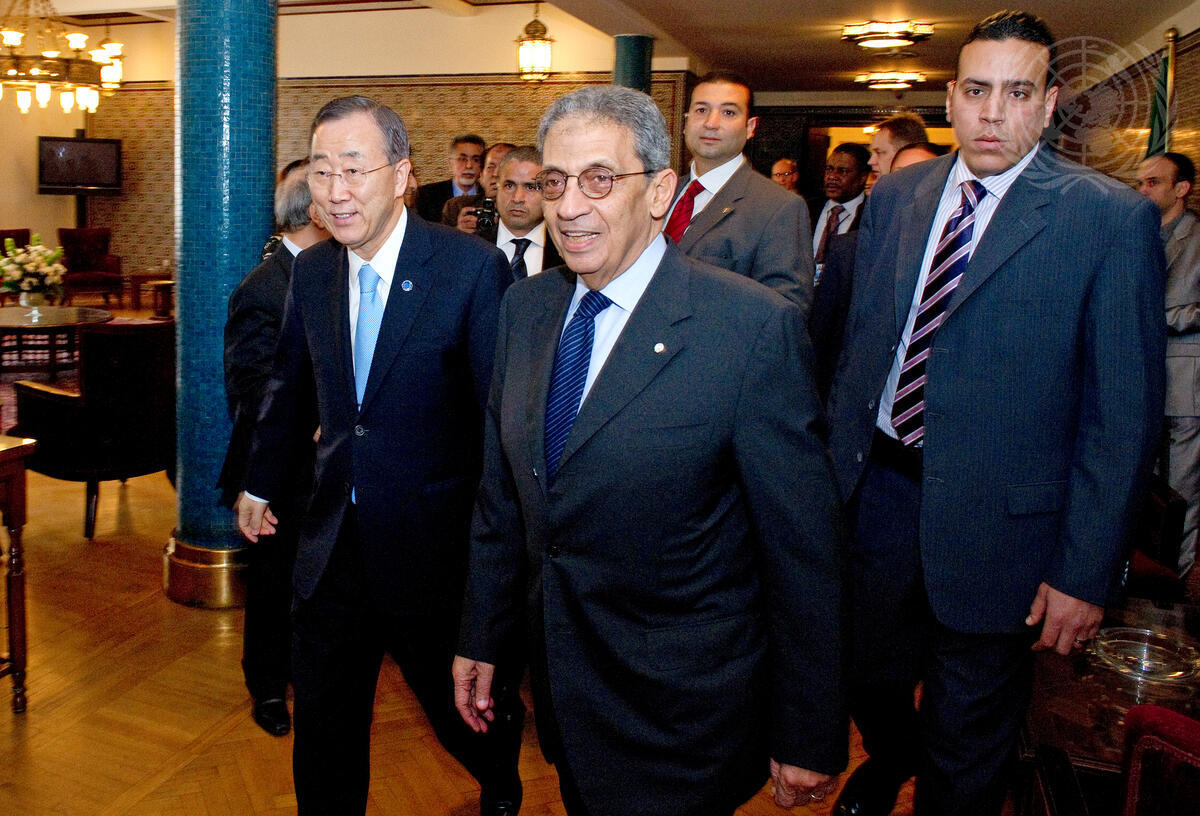Secretary-General Ban Ki-moon (front, left) and Amre M. Moussa (front, right), Secretary General of the League of Arab States, are shown en route to their meeting in Cairo, Egypt.