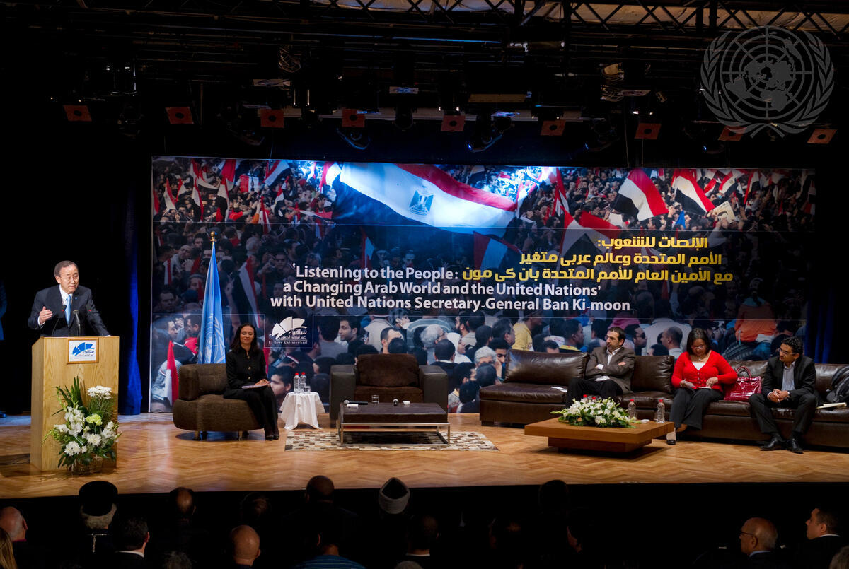 Secretary-General Ban Ki-moon (at podium) addresses audiences during the panel discussion, ""Listening to the People: A Changing Arab World and the UN”, in Cairo, Egypt. Mr. Ban was joined by panelists (seated from right) Wael Ghoneim, Middle East Regional Director for Google; Anissa Hassouna, Secretary General of the Egyptian Council for Foreign Affairs; and Ezzedine Choukri Fishere, Distinguished Visiting Lecturer at the American University in Cairo and former Adviser to the Egyptian Government.