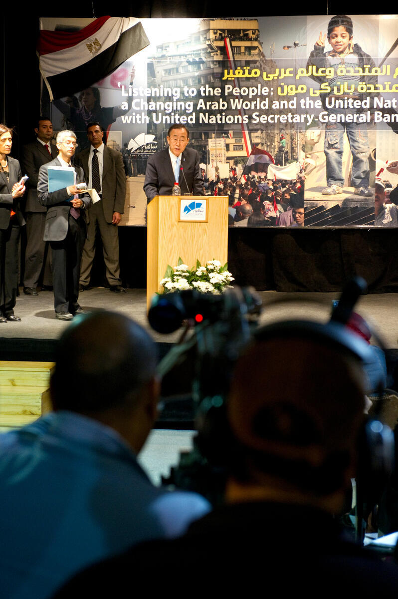Secretary-General Ban Ki-moon (at podium) briefs the press as he concludes his visit to Cairo, Egypt. Also pictured is Associate Spokesperson for Mr. Ban, Farhan Haq (front, centre).