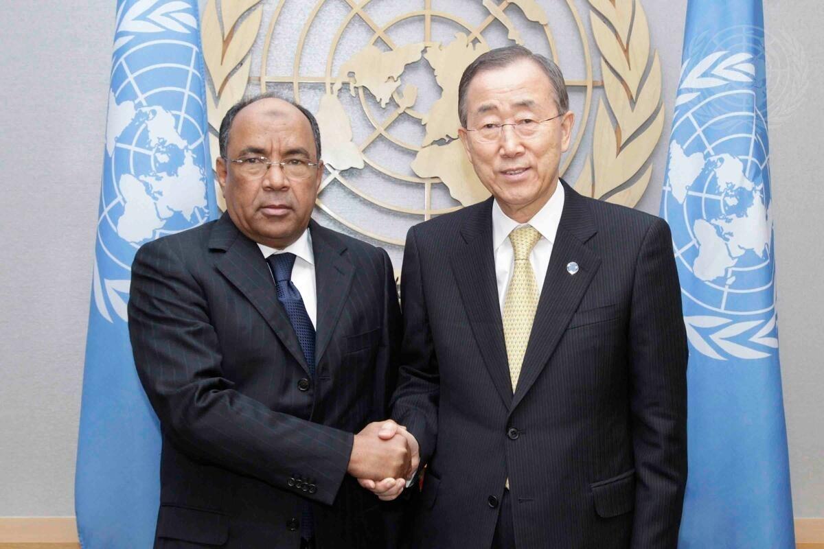 Secretary-General Ban Ki-moon (right) meets with Ahmed Ould Teguedi, new Permanent Representative of the Islamic Republic of Mauritania to the UN.