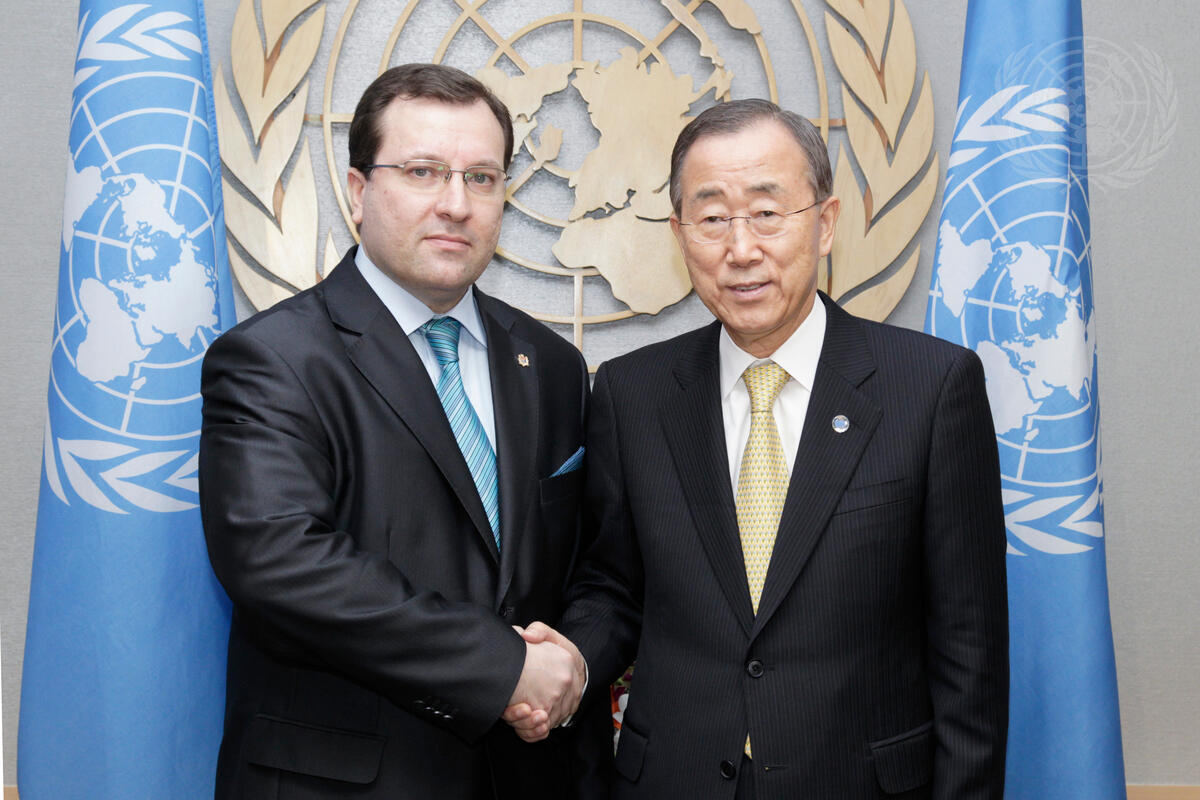 Secretary-General Ban Ki-moon (right) meets with Vladimir Lupan, new Permanent Representative of the Republic of Moldova to the UN.